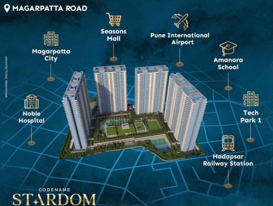 Kumar Stardom is a premium residential community in Magarpatta, Hadapsar, Pune, featuring elegant 2 BHK & 3 BHK apartments designed for luxury living. Each apartment is equipped with high-end fittings, abundant natural light, and enhanced privacy. Residents can enjoy lifestyle amenities like a yoga center, spa, infinity pool, gym, and more. The project is ideally situated near renowned schools, hospitals, and shopping malls, with easy access to major roads, the railway station, and the airport.